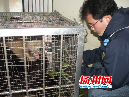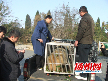 随后,六七个工作人员抬着笼子前往装车点,为了避免磕着碰着“扬扬”,工作人员小心翼翼。也许是感到即将离开生活了两年的第二故乡扬州,“扬扬”特别温顺地让趴在笼子里,拍照时也是尽量配合。笼子抬上车后,工作人员将一大块绿色的油布蒙在笼子上,并用绳索进行加固,以免“扬扬”在运输途中因受到惊吓而发生危险。