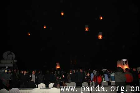 在全球七大洲的3月10日晚8点半左右,都有孔明灯升起,共同声援全球最大的应对气候变化的行动“地球一小时”。在亚洲,这一盛况出现在世界最大的大熊猫人工繁育机构——成都大熊猫繁育研究基地。昨晚,24名“地球卫士”点亮了象征全球24个时区的24盏孔明灯,“地球一小时2010活动启动仪式(中国·成都)”由此拉开帷幕。这些孔明灯上,印有“地球一小时”全球活动推广大使大熊猫“美兰”和李冰冰,中国活动推广大使崔健和李宇春的掌印。