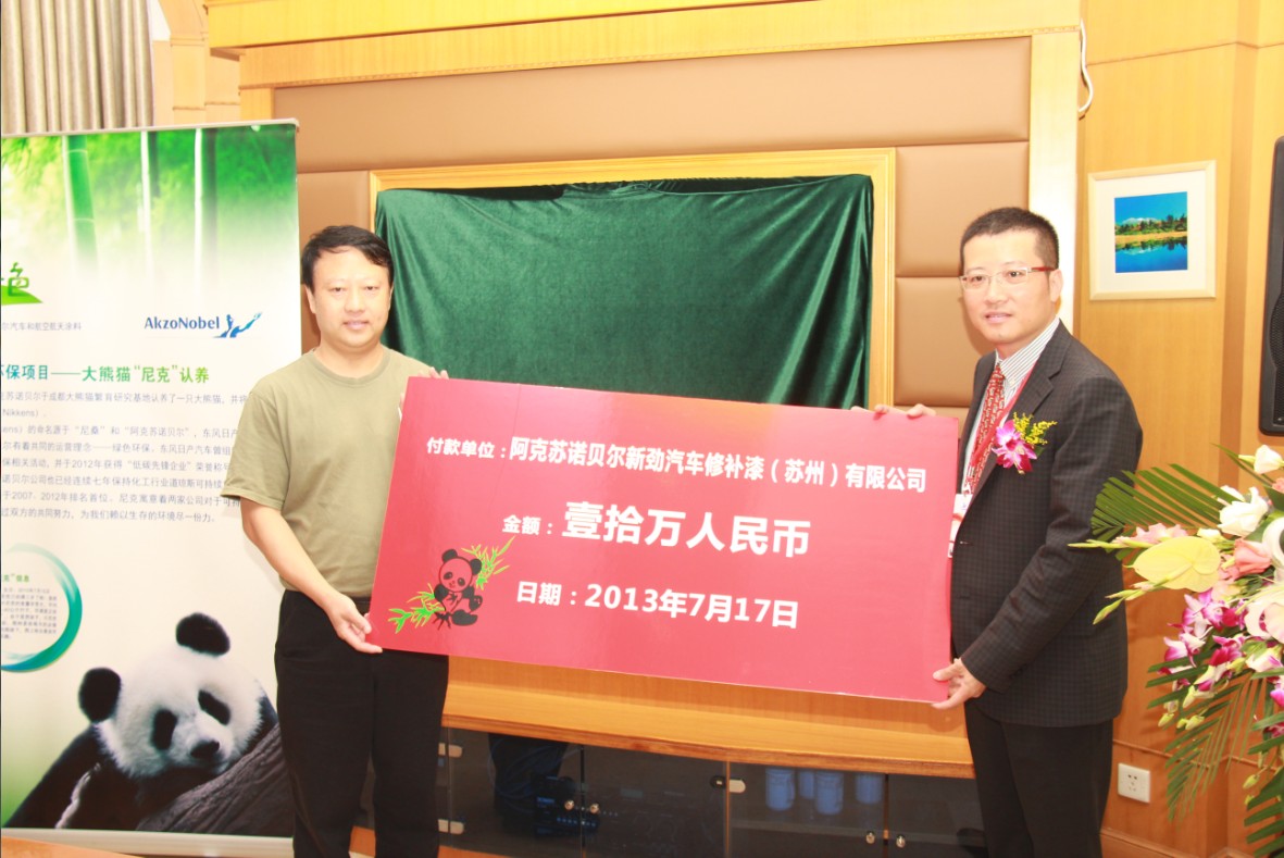 2013年7月17日上午10点正,成都大熊猫繁育研究基金会在成都大熊猫繁育研究基地会议室内,为阿克苏诺贝尔汽车和航空航天涂料公司举行大熊猫“尼克”的认养仪式。