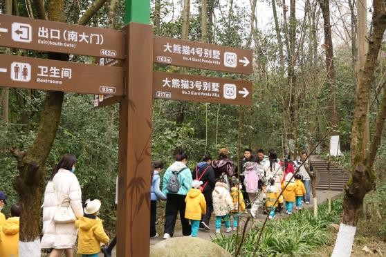 活动开启后,小朋友们一路经过四号五号别墅,沿途欣赏到了憨态可掬的大熊猫,我会科普教员同时为师生家长代表们科普熊猫相关的知识,让大家对熊猫的习性有了基础的了解。第二站来到月亮产房,这里是幼年熊猫宝宝的温暖摇篮,在户外场馆,大家可以清楚仔细地观察到每只熊猫的形态、表情和性格,在科普教员耐心细致的讲解下,小朋友们了解到熊猫宝宝从出生时的弱小到逐渐成长的艰辛过程,对生命的奇迹有了更深刻的感悟。随后,科普教员又带领大家前往胜日馆、云日馆和旭日馆。在这些场馆里,憨态可掬的大熊猫们或悠然自得地吃着竹子,或慵懒地坐在树上睡觉,小朋友们目不转睛地观察着大熊猫的一举一动,纷纷与远处的熊猫合影留念。