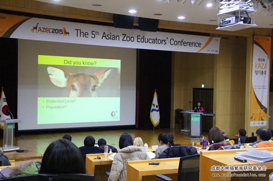 2015年12月8日上午10点(当地时间),由韩国首尔动物园承办的第五届亚洲动物园教育者大会在首尔人力资源发展中心正式开幕。当天下午,由成都大熊猫繁育研究基金会(以下简称我会)资助的《豚鹿保护教育推广项目》在会上以演示文稿和录像形式向亚洲动物保护领域的专家和学者作了汇报。豚鹿为我国一级重点保护动物,被列入《世界自然保护联盟》2012年濒危物种红色名录,但遗憾的是,早在上世纪60年代它们在我国野外已经灭绝。现在中国豚鹿圈养种群数量不足60只,其中有40余只生活在成都动物园。为了号召更多的人来了解和保护豚鹿,发挥保育机构的教育职能,2012年,本会正式资助成都动物园建立了《豚鹿保护教育推广项目》,进一步加强豚鹿保护的力度。该项目的目标旨在提高人们对豚鹿危机的意识,宣传人人都可以为保护生物多样性做出自己的贡献。