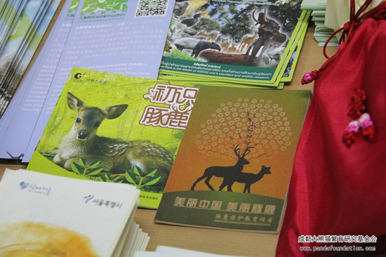 会议开展的同时,在各个动物保育机构和组织的交流分享区内,来自我会的科普教员整齐地摆放了由我会资助印刷出版的《初识豚鹿》画册和志愿者手册,免费分享给与会的各位专家和学者。