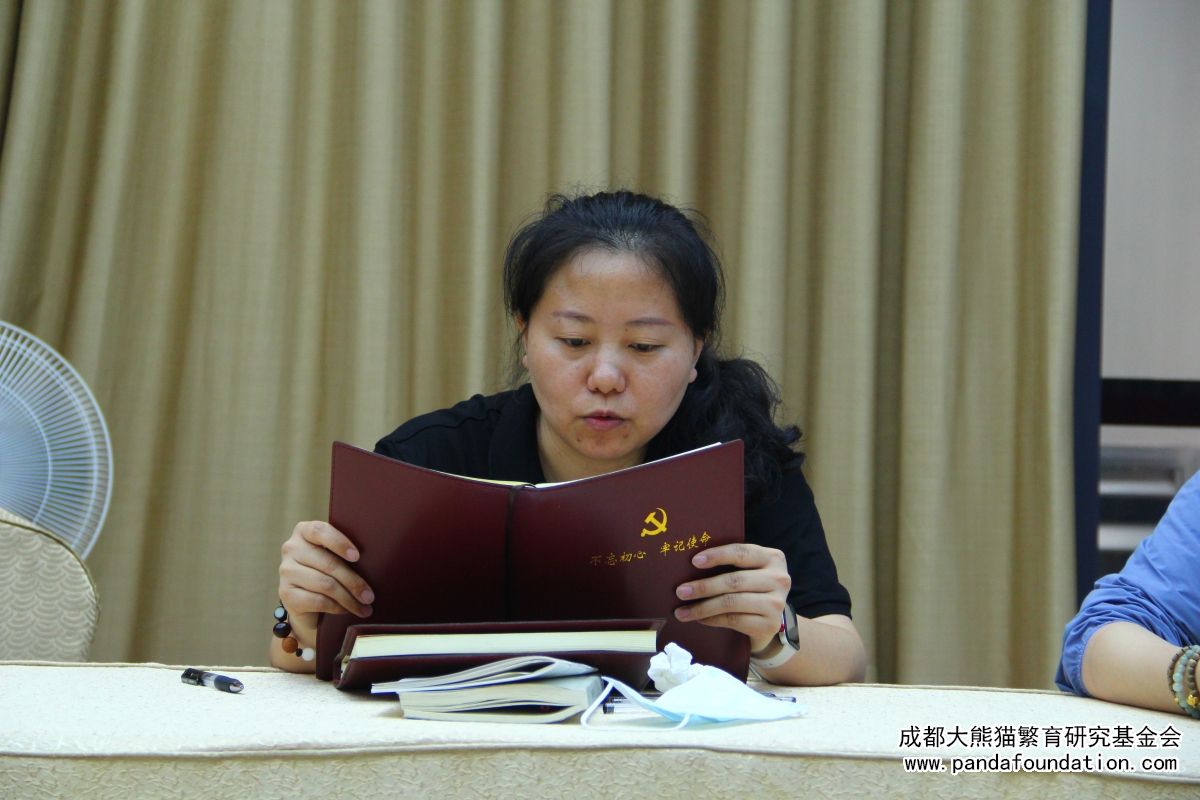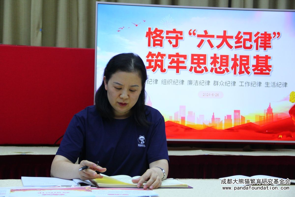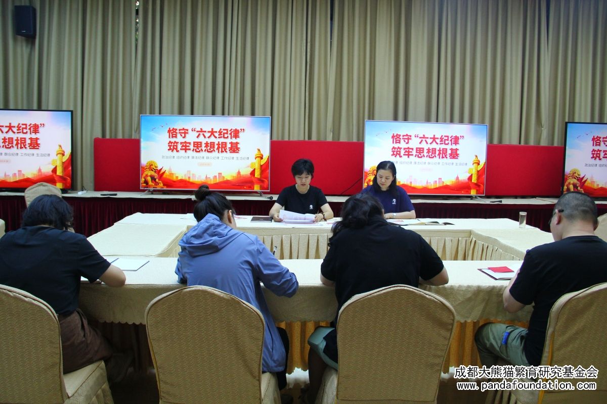 按照党纪学习教育工作安排, 6月26日下午两点,成都大熊猫繁育研究基金会党支部书记卿娟同志以恪守“六大纪律”筑牢思想根基为题,向全体党员讲授党纪学习教育专题党课。