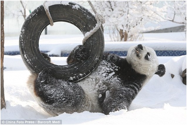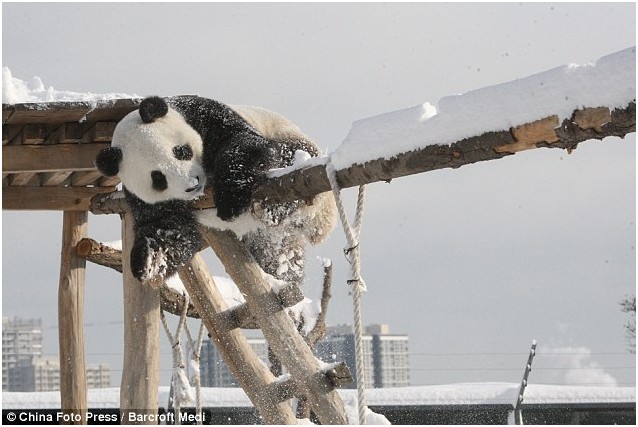 它的玩伴,五岁大熊猫华奥同样对下雪感到兴奋不已,并尝试去走被雪覆盖的栖架。