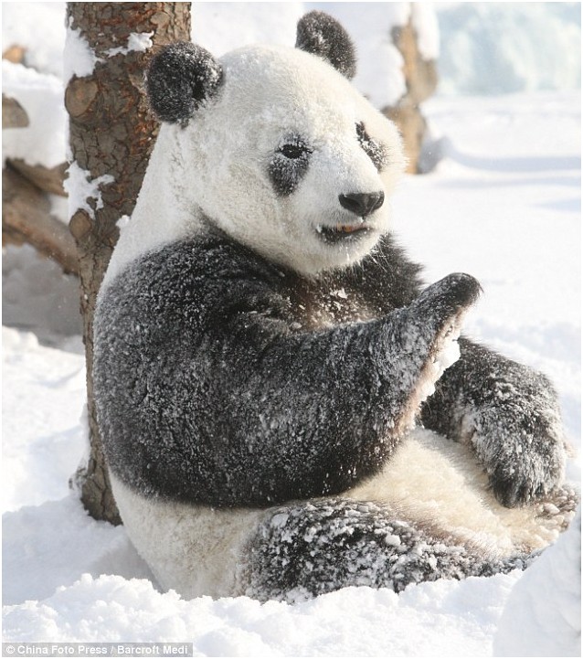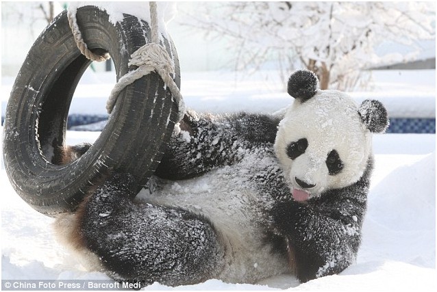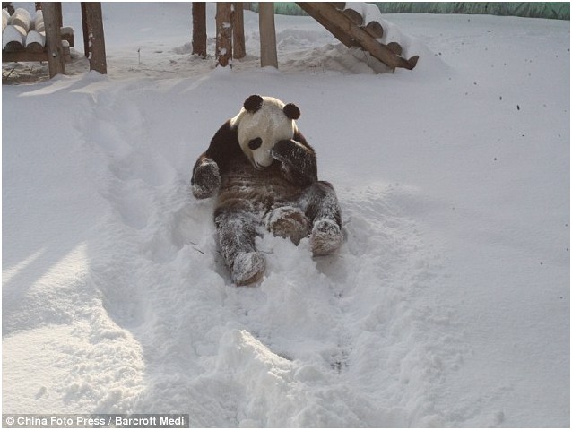 谁说冷啊?雪后中国大熊猫清风在室外度过欢乐时光