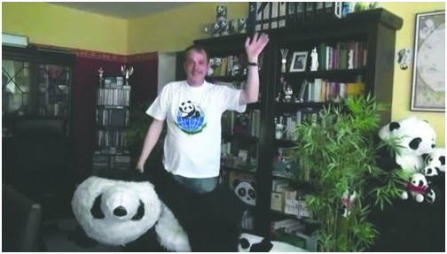 一只白白胖胖的“大熊猫”从一辆贴着卡通熊猫贴纸的小汽车上走下来,大摇大摆地走进了一间摆满竹子的房间,房内的墙上挂满了熊猫的照片,书架上则摆设着熊猫水杯……“大熊猫”转过身,揭开他的熊猫衣服,对着镜头潇洒地挥了挥手———这正是德国选手安德烈亚斯•弗洛伊德(Andreas Freund)。