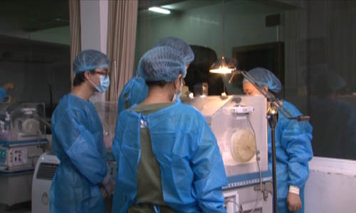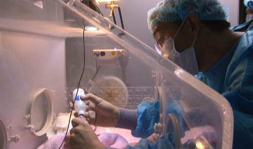 工作人员在为熊猫宝宝做“体检”