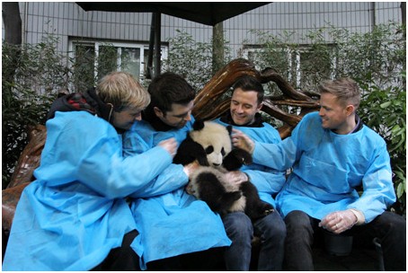 “西城男孩”、张杰一起在大熊猫产房与熊猫幼崽合影。熊猫宝宝可不认识把自己抱在怀里的这几位大帅哥,四肢爪子不停的动弹,让“西城男孩”有点手足无措。