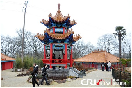 博瓦勒动物园熊猫馆内中式色彩的亭台楼阁