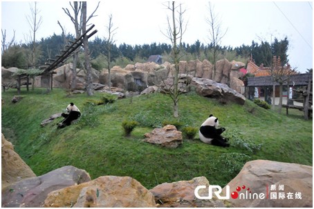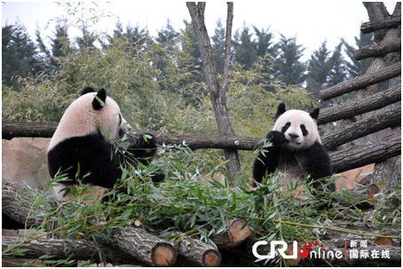 中国成都的大熊猫“欢欢”和“圆仔” 经过1个月左右的检疫隔离和适应期后,正式在法国博瓦勒野生动物园与游客见面。
