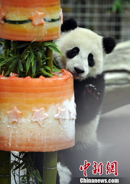 当地时间7月29日,美国圣地亚哥动物园大熊猫“小礼物”在众多参观者的惊喜注视下,吃上了其降生后的第一个“生日蛋糕”。为了庆祝“小礼物”的周岁生日,工作人员在熊猫园内摆放了许多“礼物盒”,还专门制作了加有蜂蜜和水果的冰蛋糕。据工作人员介绍,这也是“小礼物”平生第一次吃到奶以外的甜味食品。