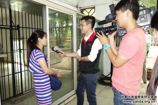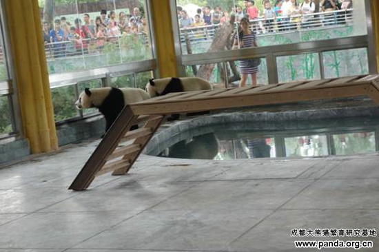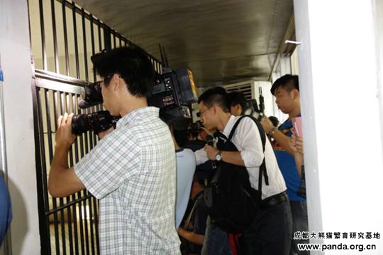 游客们在熊猫馆外夹道欢迎这对熊猫姐妹花的到来