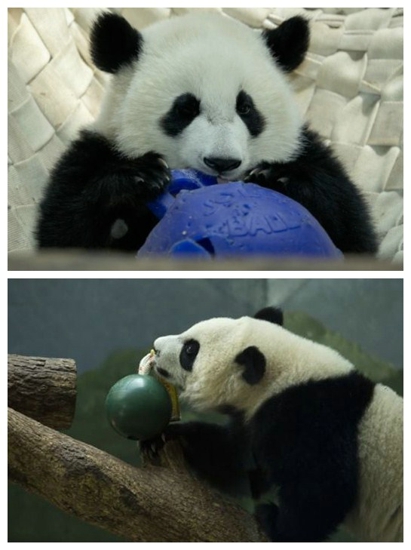 刚刚度过一岁生日的“美轮”和“美奂”,爱吃,爱动,对世界一切都充满了好奇。两个宝宝虽然是双胞胎,但是性格却又是那么地不同。姐姐“美轮”,天生的享乐派,就像被美国文化熏陶久了,任何事情对她来说都是一种体验和娱乐。在接受行为训练的时候,她总是选择她喜欢做的,而且从来都是淡淡定定,不急不躁,这点有点像她们的大哥哥“美兰”。但是 “美奂”就不一样,好像骨子里的中国文化影响多一点,做任何事情都非常认真专注,在接受行为训练的时候,花费的时间比起她的姐姐要少得多。