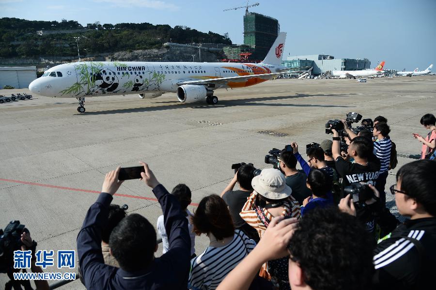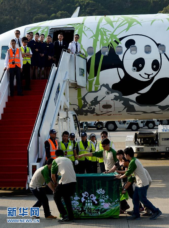 4月30日,人们在澳门机场迎接大熊猫。当日16时许,中央政府赠送澳门的新一对大熊猫运抵澳门,澳门特区政府行政法务司司长陈海帆等官员及部分少年儿童在机场迎接。