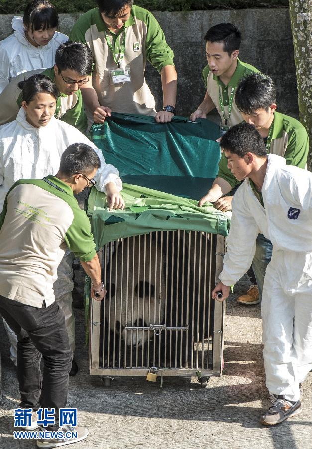 4月30日,工作人员将大熊猫运送到澳门路环金像农场的隔离设施地点。大熊猫经检疫人员检查后在运输笼中向前来接机的人们短暂亮相。目前它们身体状况良好,随后将前往金像农场进行30天隔离检疫。新华社记者张金加摄