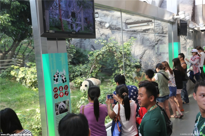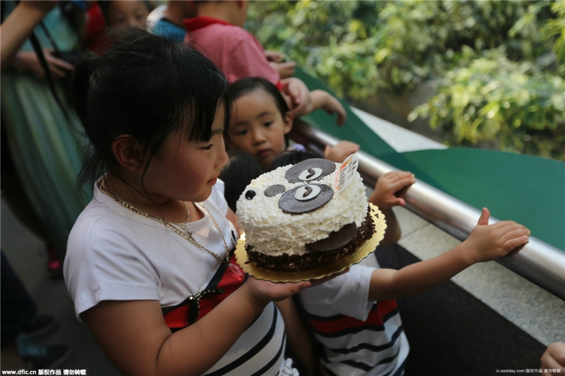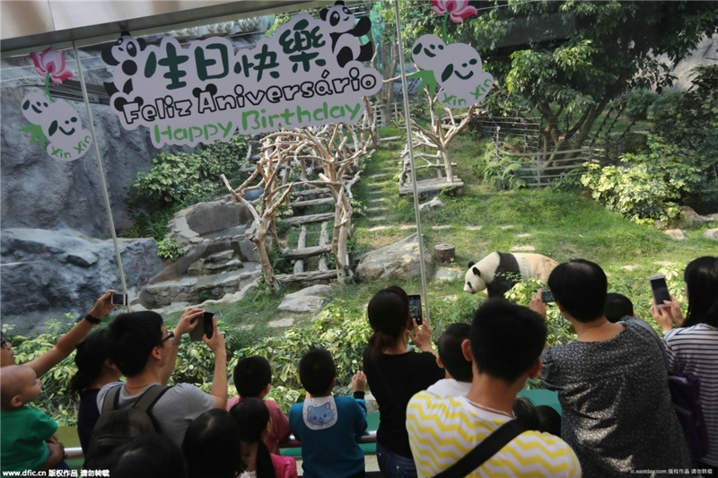 2015年7月5日,中国澳门,中央政府赠澳门大熊猫“心心”8岁生日,这也是“心心”在澳门度过首个生日,澳门特区政府特别为“心心”举办生日派对,送上精心准备的水果冰蛋糕,前来参观的澳门小朋友,也带来生日蛋糕,隔着玻璃窗,祝福“心心”生日快乐,大人孩子们用手机、照相机拍下这快乐一幕。