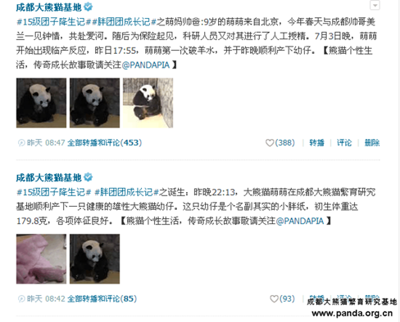 7月5日08:30左右,成都大熊猫基地官方微博及时播报了#15级团子降生记##胖团团成长记#话题,据统计,截止目前,该话题转播及评论人数逾550人次,浏览人数达840万人次。