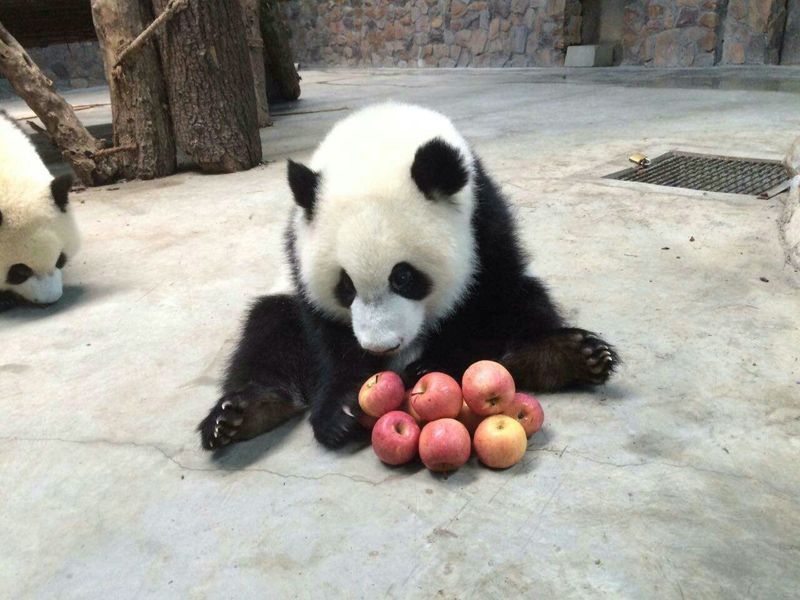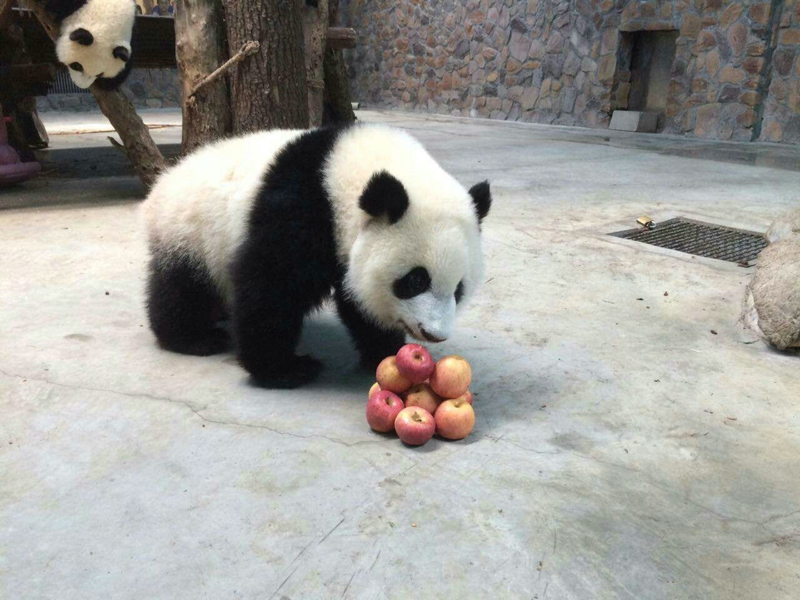 最遥远的祝福来自一对瑞士小姐妹,丽雅和艾希。她们不仅十分痴迷于大熊猫,也是“奶萌喜”的认养人。一说起大熊猫,她俩可以滔滔不绝地说上好几个小时,任何一个人都可以从她们愉悦的表情和极快的语速中感受到他们对大熊猫的热忱。小姐妹一家人在不久前不远万里来到中国,唯一的目的就是来四川认养一只大熊猫。最开始,他们选取了好几只大熊猫,一家人商量了一下,最终选择2014年8月出生的大熊猫“七喜”作为终身认养对象。早在“七喜”生日的前半个月,丽雅和艾希就在积极联系工作人员,想给“七喜”送上一份独特的生日礼物,在仔细听取饲养员的建议后,她们决定拜托饲养员送一个熊猫蛋糕给“七喜”。虽然实施的时候恰好遇到当日“4喜临门”(8月3日有两对双胞胎出生),饲养员们没办法挤出时间完成蛋糕,但是他们却给“七喜”准备了另外一个惊喜——一个美味的苹果塔!看起来也是甜美丰盛,对“七喜”来说也是喜欢得紧呢!除此外,小姐妹还录了一段祝福的视频送给远在中国的“七喜”。