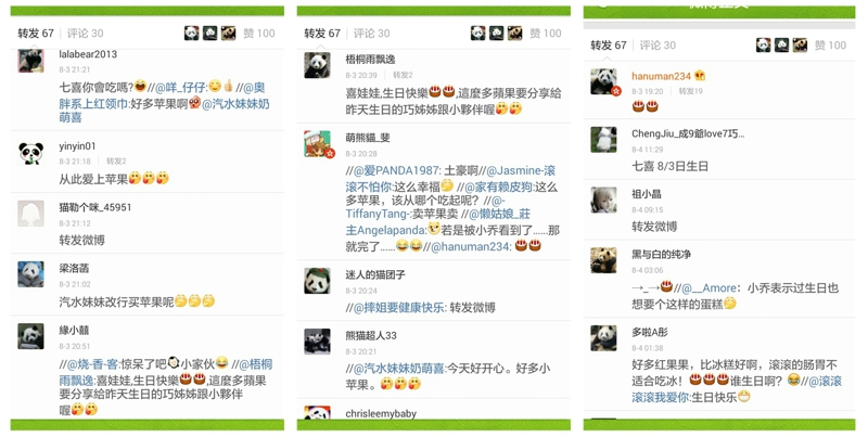 最暖心的祝福来自“七喜”的奶爸奶妈们。包括“七喜”出生不久照料过它的汤奶妈,别看这位奶妈外表弱不禁风,却能轻飘飘地抱起比她头还大两倍的“七喜”! 除了强壮的奶妈,还有心思细腻的奶爸:7、8月的熊猫婴儿潮让奶妈奶爸们简直忙晕了头,但是那么忙的时候,乔奶爸还是记得给萌萌哒的“七喜”堆了一个漂(简)亮(单)可(粗)口(暴)的苹果塔,果然是真爱呀!感谢奶爸!