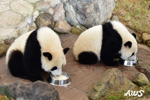 “樱浜”、“桃浜”:“现在我们已经告别奶瓶啦!刚出生时,我们吃奶都是‘良浜’妈妈和奶爸奶妈喂我们,后来我们长大了一些可以自己拿着奶瓶喝奶了。而现在我们已经告别奶瓶,开始喝盆盆奶了喔。”