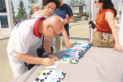 米兰世博会成都周活动上,来自法国的游客Monnet在填写熊猫明信片。