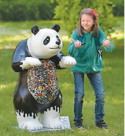 柏林亚太周的彩绘熊猫展上,一位德国小女孩与熊猫塑像合影。