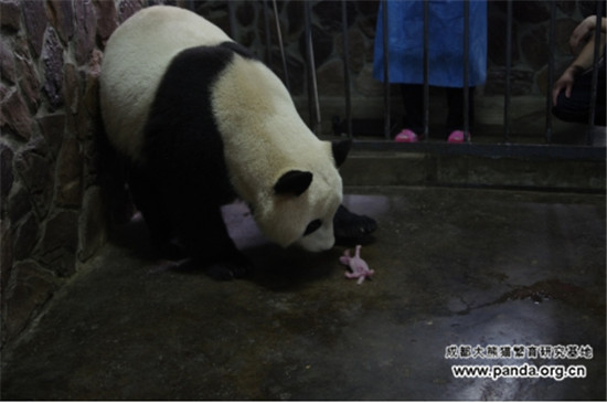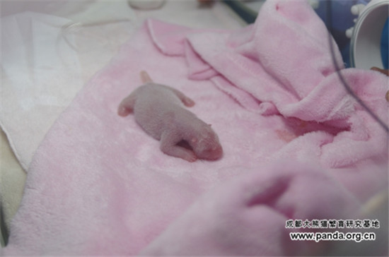 2016年5月29日,早上6点,成都大熊猫繁育研究基地海归大熊猫“梅浜”喜获一只雌性大熊猫宝宝,体重135g。目前,母子体征良好,各项指标正常。