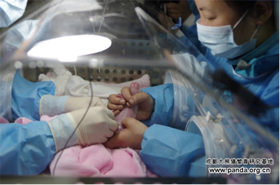 据饲养员介绍,经过20余天的减食,5月28日,“梅浜”在兽舍内不停走动,表现烦躁不安的生产征兆,22点53分,破羊水,29日上午6点顺利产 仔。“梅浜”初次当妈妈,“小梅浜”出生后,初为猫母的她可能还不知道怎么回事,对地上哇哇大叫的宝宝并不理会,更没有像其他妈妈一样马上把宝宝含起来抱 进怀里,在场的工作人员一再给她机会,她还是只一味地去舔断掉的脐带,眼看时间一分一秒的过去,地上的宝宝体温正在降低,如果不马上拿出来保温就会有生命 危险。无奈之下,工作人员将幼仔从地上取出,迅速放进保温箱里,此时幼仔的体温已经只有33.2℃,工作人员赶紧将保温箱温度升高,并用掌心护住幼仔给她 取暖,经过1个多小时,宝宝的体温慢慢恢复到正常水平。在为她剪去脐带,并补了一次母乳后,工作人员还是决定把宝宝还给“梅浜”,希望她这次能带她。当工 作人员再次将宝宝放在“梅浜”面前时,本来在睡觉的她起初还是没什么反应,但也许是宝宝不断呼唤妈妈的叫声刺激了她的母性,她终于站起身,在反复尝试后将 宝宝含起来抱进怀里,并开始不停舔舐。