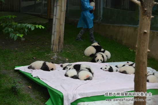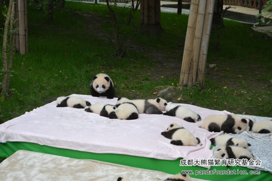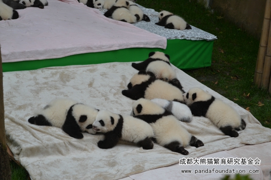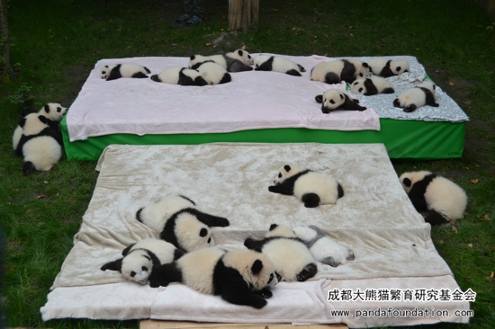 10月11日,我们再次迎来了2016级熊猫宝宝的“T台走秀”,23只熊猫宝宝在大熊猫月亮产房活动场齐聚一堂。“幕后更衣”,熊猫宝宝们统一着装,穿着黑白相间的“皮大衣”,虽然天气降到了10度左右,但穿着“皮大衣”的它们一点也不怕冷。