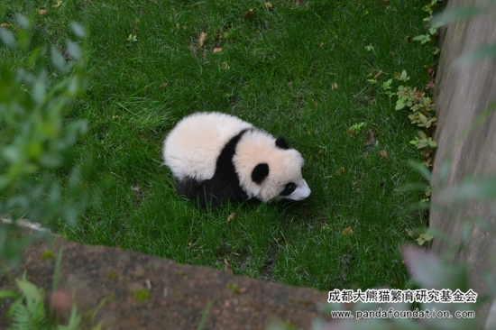 观众的相机“咔嚓,咔嚓”地工作个不停。突然间人群中躁动起来,原来是今天的主角来了,它是唯一一个自己迈着轻盈步子来到“T台”的,于是一出场立刻成为了HOLD住全场的熊猫明星。大家都惊讶了:“这位‘模特’动作真麻利,它是谁呀?”原来它是2016级熊猫宝宝中的“班长”,快满5月龄的“梅兰”。作为2016级的班长,梅兰一会儿跑到“台上”,一会儿跑去“台下”,满场都能看见它的身影。只见它摇头晃脑,迈着正步威风凛凛地从弟弟妹妹间穿行而过,甚至还想用自己软软的小爪子爬上树梢与观众们打招呼——当然,这样的想法暂时失败了,因为现在的它还没有掌握爬树的本领呢。