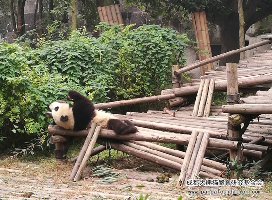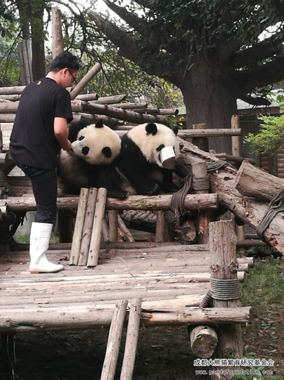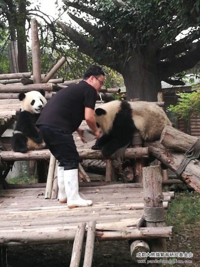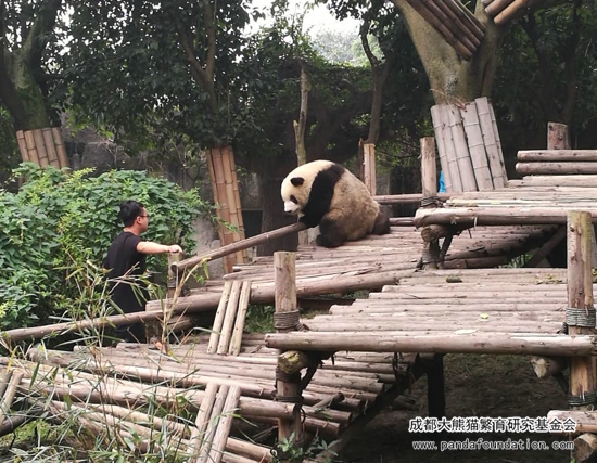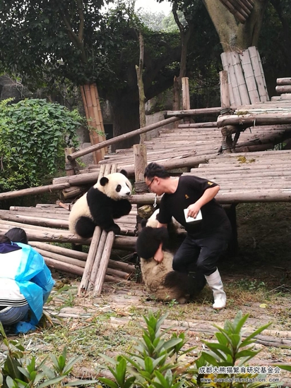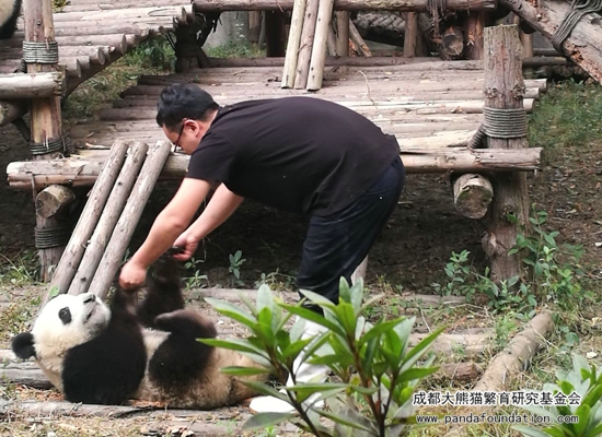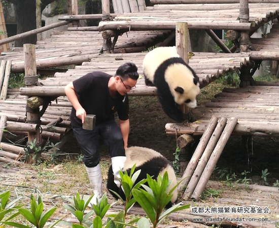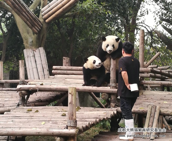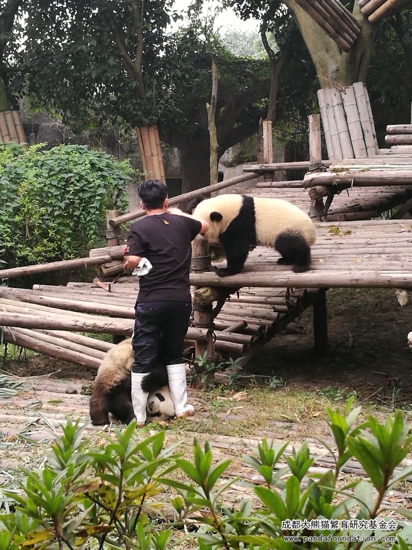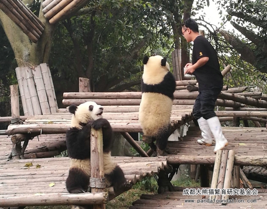 大熊猫作为一个“明明可以凭实力却偏偏要靠卖萌为生”的猛兽,战斗力强劲可不是浪得虚名。为了更好地在圈养条件下为大熊猫检查身体,进行采血、打疫苗等一系列行为,饲养员必须从小对它们进行行为训练,避免它们在今后的生活中伤害到自身或与它们进行近距离接触的饲养员。当天进行的这场训练,在时间的选择上是基于给运动场里另外一只照顾“萌兰”和“启启”的雌性成年大熊猫“科琳”更换食物这一时机,在成年大熊猫回到兽舍内的情况下,保证了饲养员的安全,同时通过训练的方式吸引“萌兰”和“启启”,避免它们过多干扰更换食物的饲养员。所以游客们所感受到的、十分精彩的“表演效果”,只是可爱的“萌兰”和“启启”带来的一堂日常行为训练课!