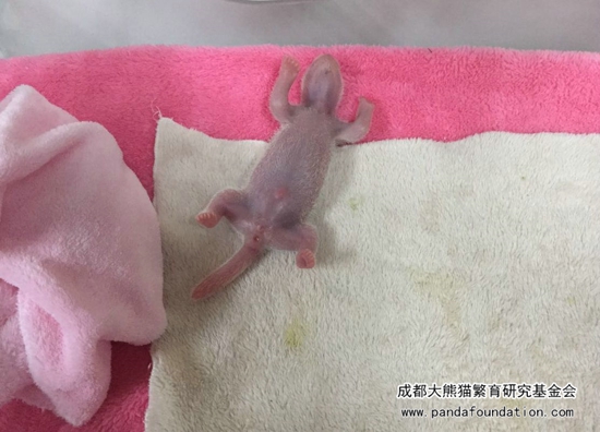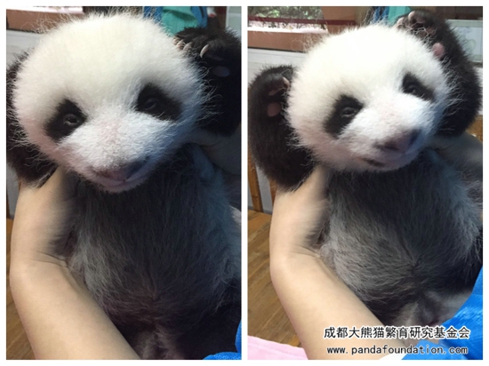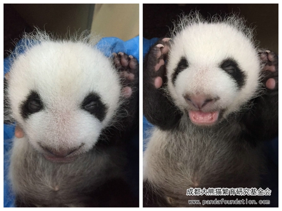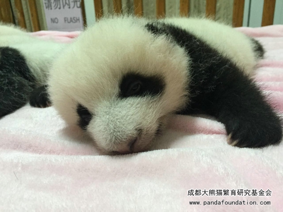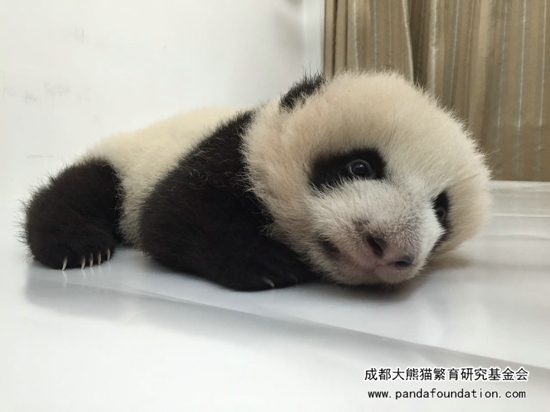 一个月左右,“肉肉”黑色的毛发开始长出来啦!这个时候就黑白分明,看起来终于像一只大熊猫啦。