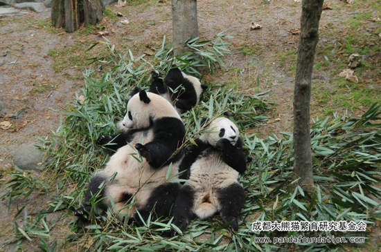 沿着主路一路上往上走,在主路左侧会出现一段阶梯,我们拾级而上,首先看到的就是1号别墅了。这里住着人气大熊猫“奥莉奥”、“园润”和“淼淼”。它们于2012年出生,是感情很好的三兄妹,经常滚作一团,弄得身上脏兮兮的,因此还被粉丝们亲切地称为“挖煤三宝”。与它们一同住在1号别墅的,是隔壁的“小丫头”一家。