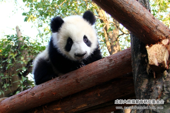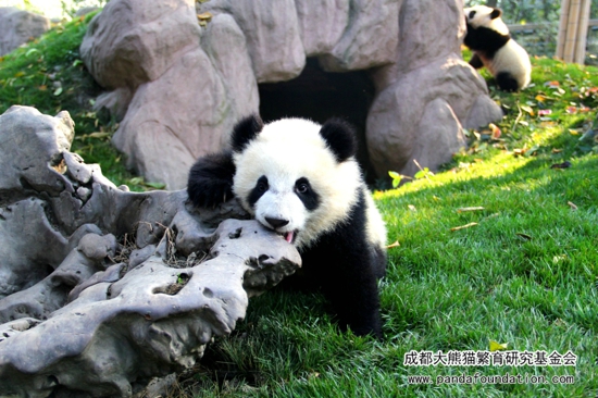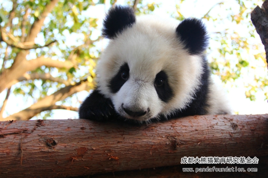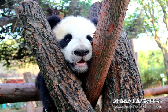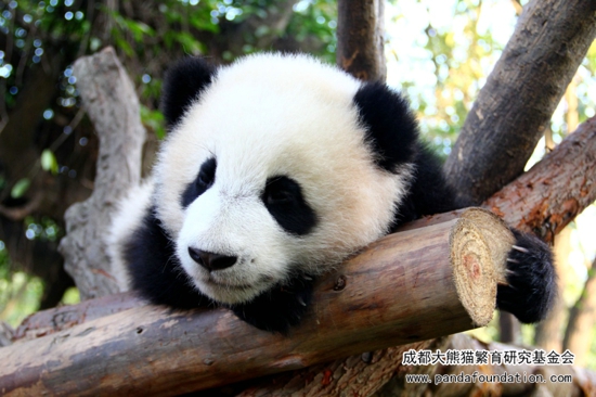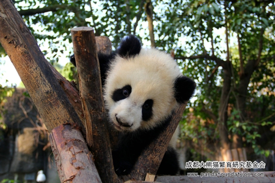“福顺”和“福来”年龄相对较小,都比较安静,没有哥哥姐姐们那么调皮。“福顺”找了一个绝佳的位置惬意地趴着,“福来”也舒舒服服地抱着一根木柱玩。