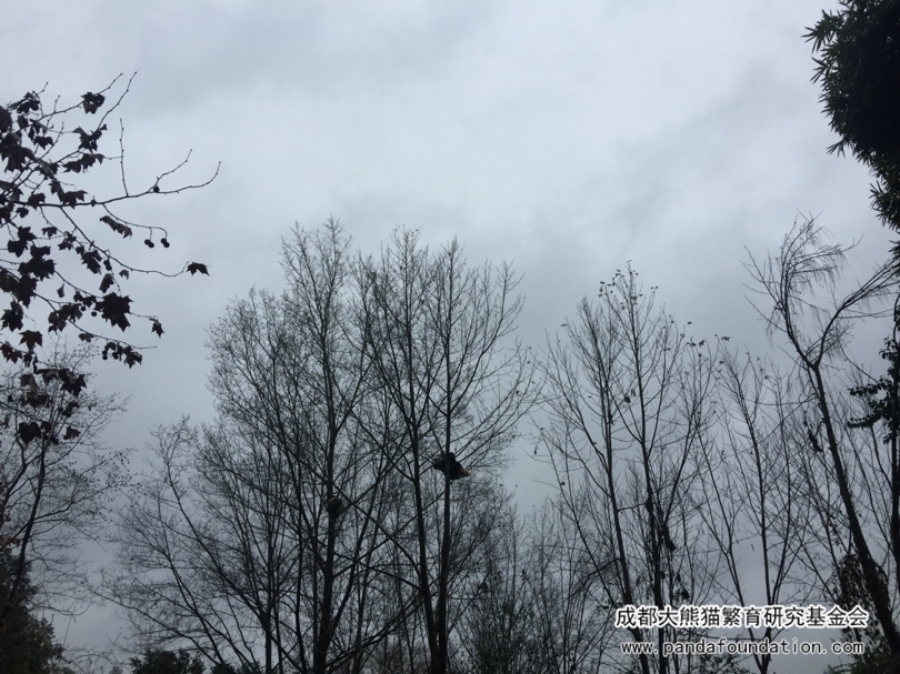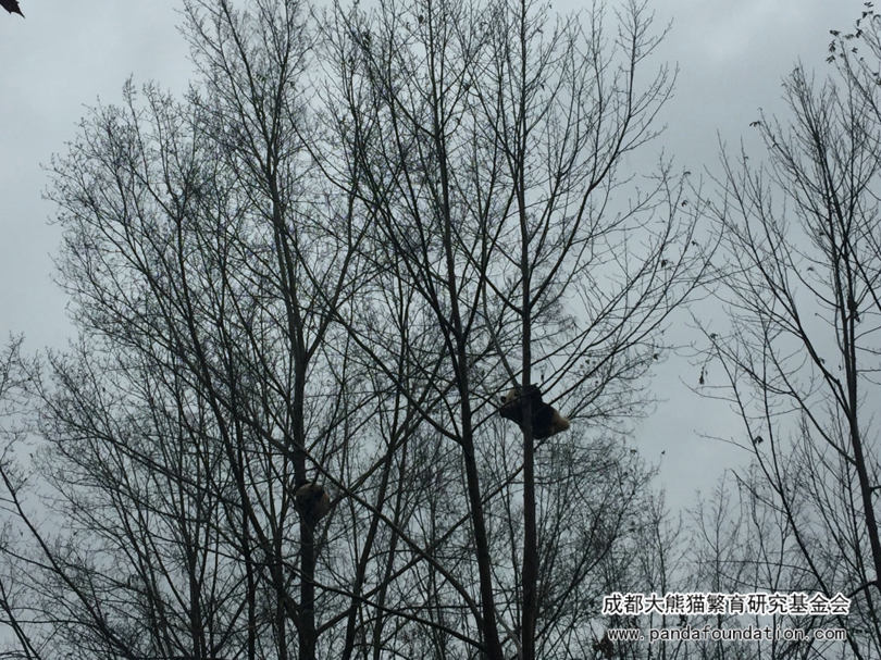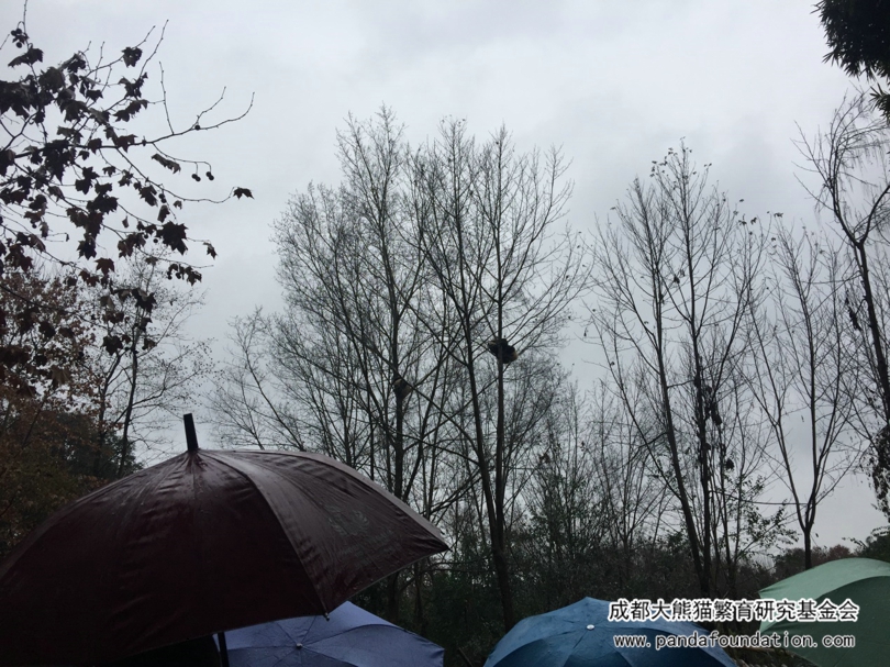 终于发现了目标,远远的、顶着绵绵春雨在树上睡觉的“晶奥”和“晶运”,挂在高高的树杈上,一点儿也不怕雨水和寒冷。看不清?那咱们再近一点儿。