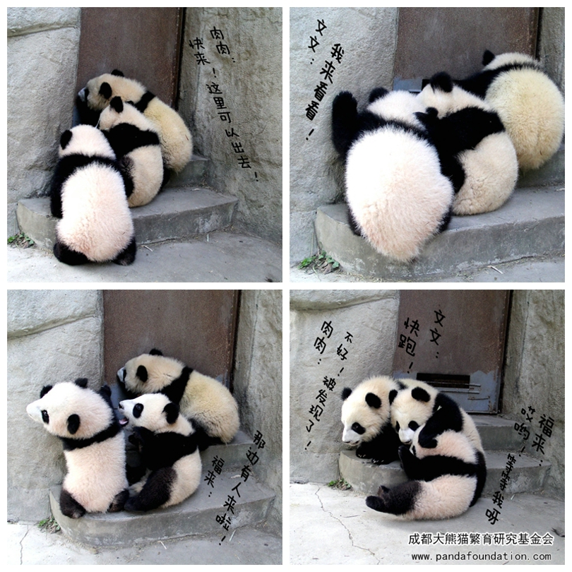 现在“肉肉(梅兰)”和文文也经常腻歪在一起,一起玩耍,一起吃笋,一起喝盆盆奶,或是带领着弟弟妹妹们怼草怼树、怼奶妈奶爸、怼摄像小哥,当然也不会忘了经常互怼,日子也是过得快快乐乐,无忧无虑。
