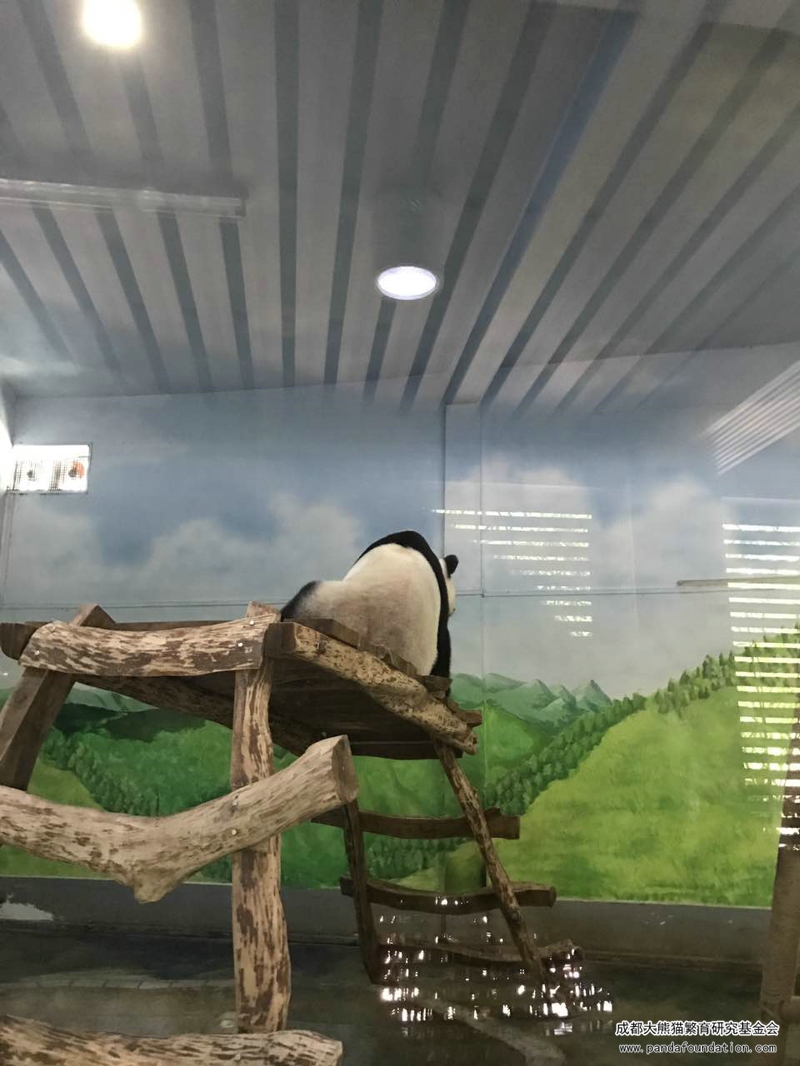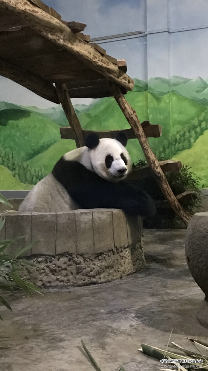 到处玩了一会儿,“蜀琳”动作麻利地上了木架床,生活作息规律的小寿星准备午睡了!~