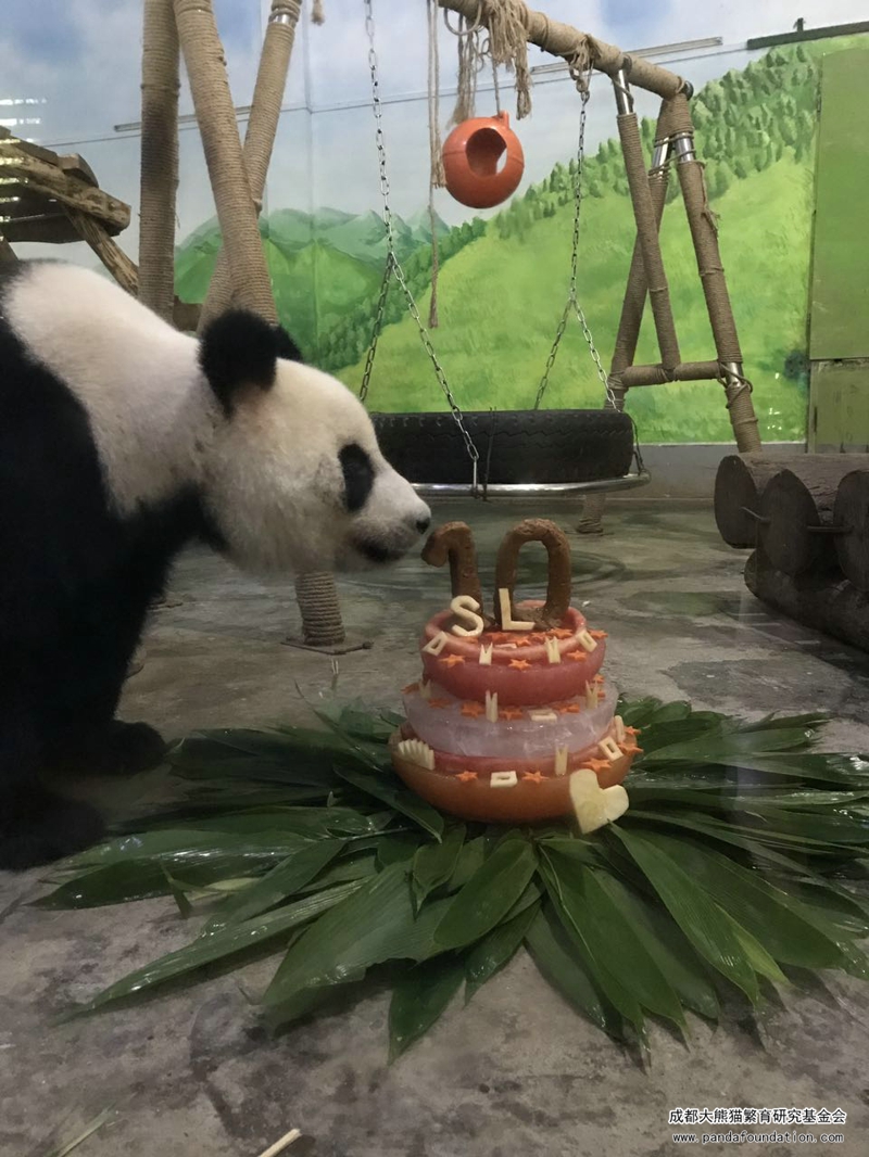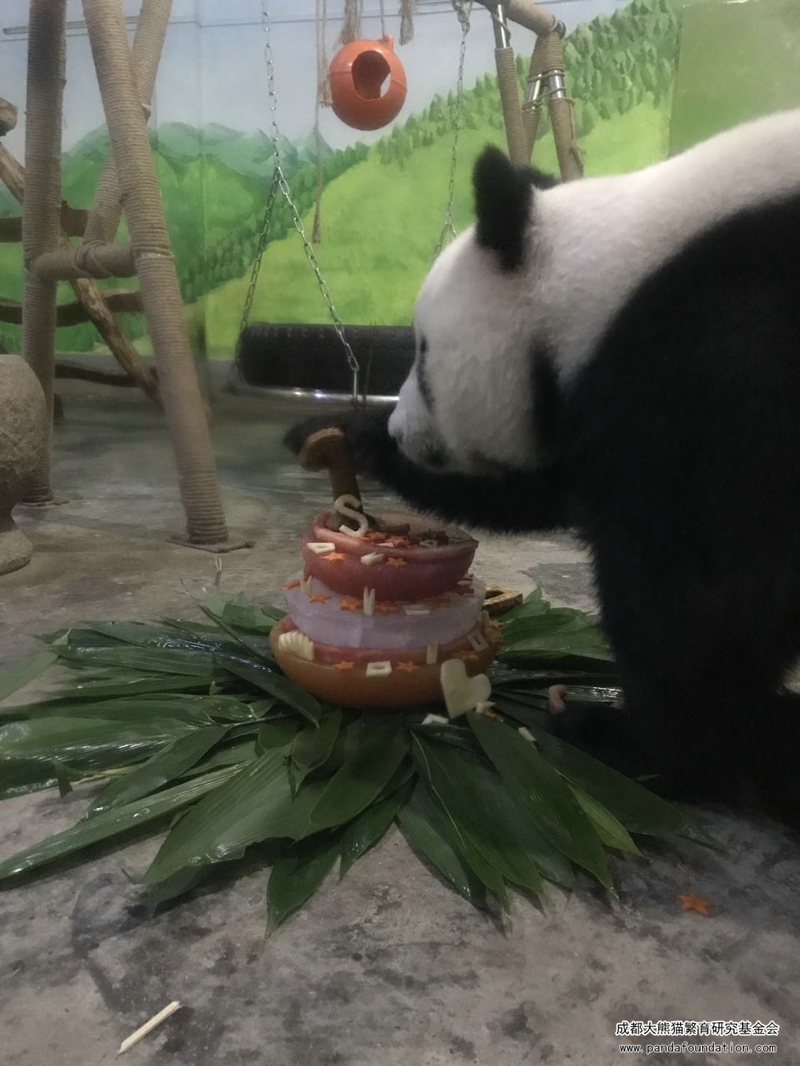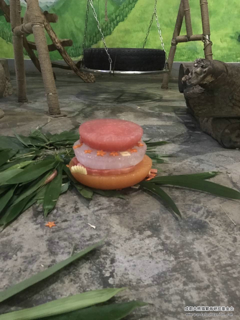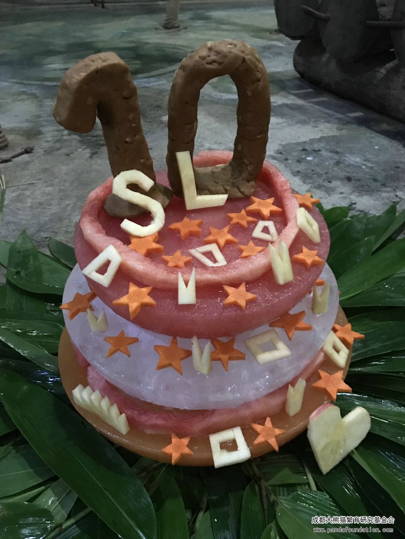 生日会主角“蜀琳”从内场慢悠悠地走出来,眼尖的它发现了奶妈留下的路标——一条由苹果条打造的“生日大道”,走着走着闻到了它最爱的窝头味道,缓缓靠近冰蛋糕。