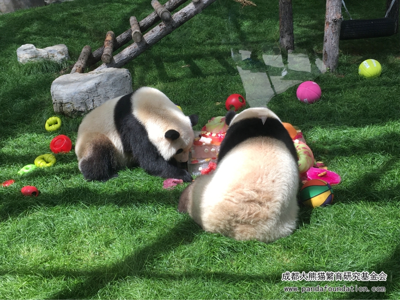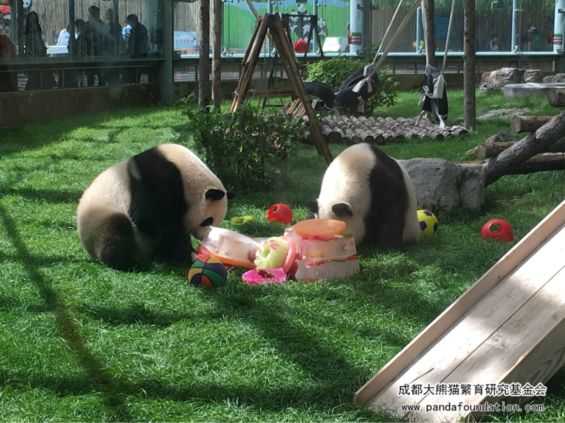 接着,奶爸奶妈们为“七巧”“七喜”精心的准备了美味的冰蛋糕,放在室外活动场。我们的主角“七巧”“七喜”从室内慢悠悠地走了出来,一下子就被漂亮的冰蛋糕吸引了注意力,径直走向了冰蛋糕,稍微观察了一下就开始大快朵颐起来。此时,外围的游客开始唱起生日歌,一起祝“七巧”“七喜”生日快乐!
