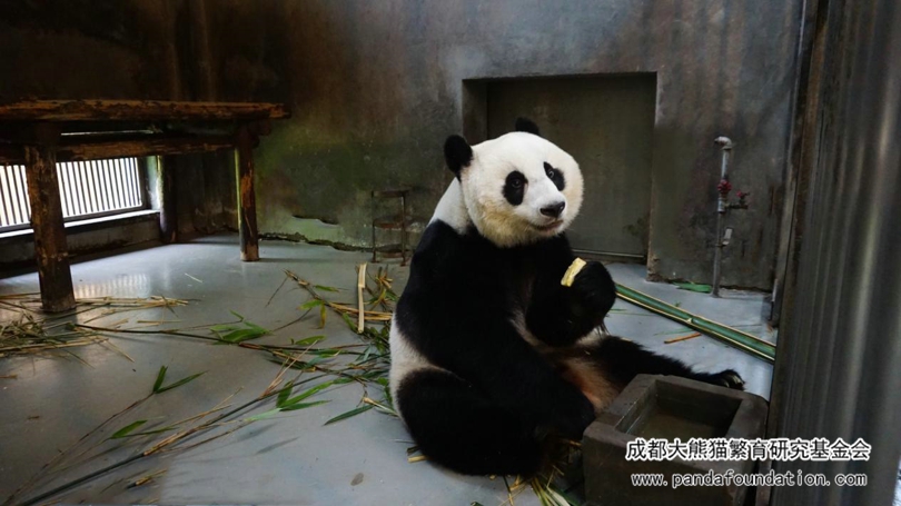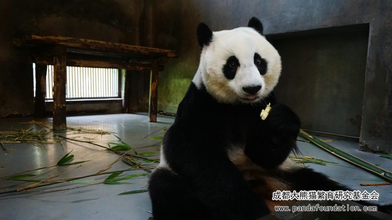 2017年8月,由产房搬到“昭美”在大熊猫二号别墅室内吃零食,还是那么狡黠可爱。