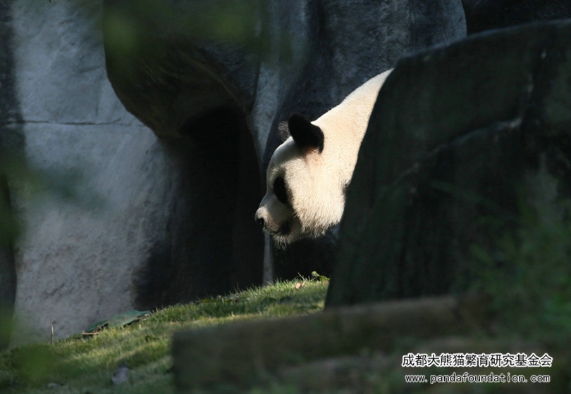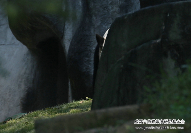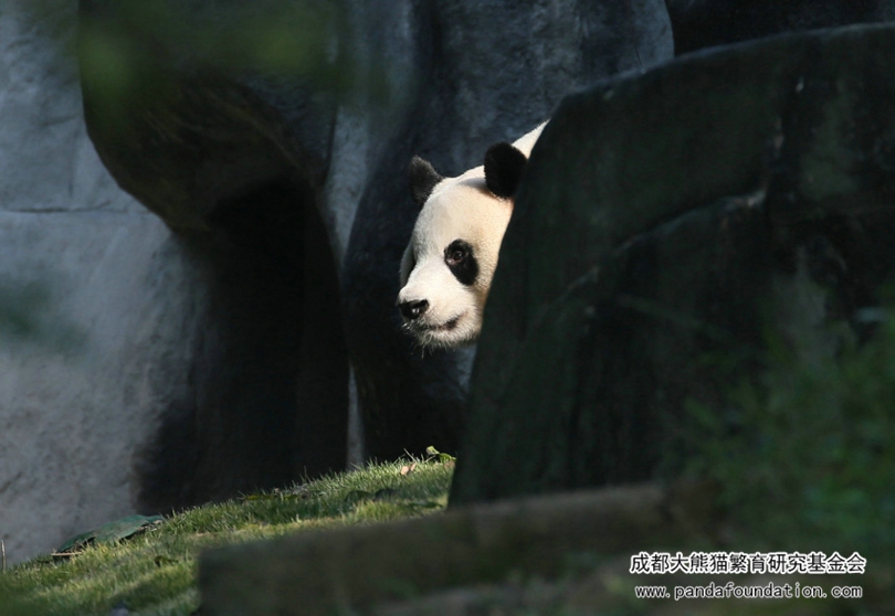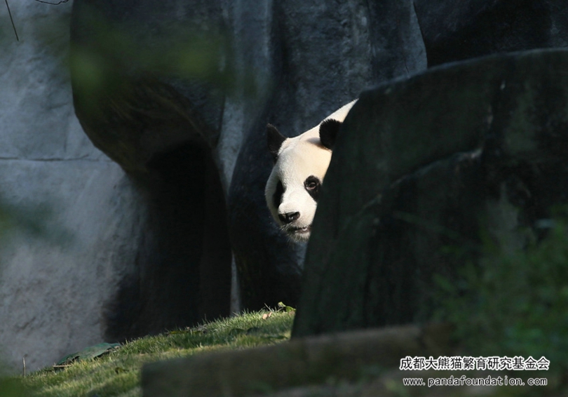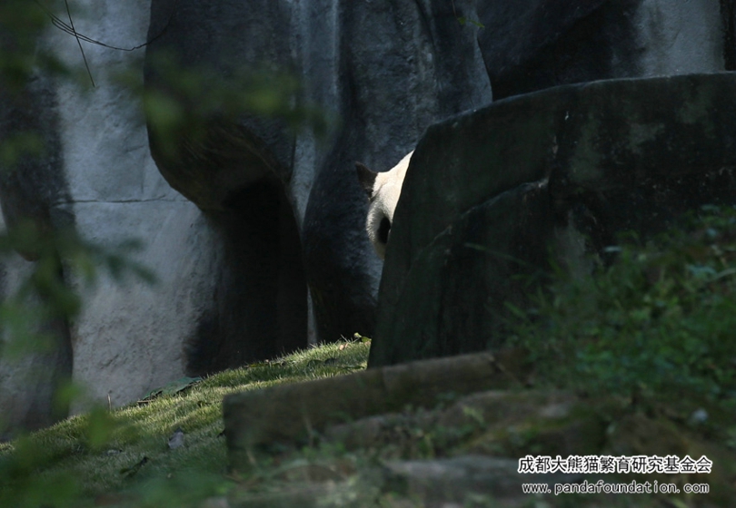 清晨,奶爸奶妈们清扫完运动场,为国宝们准备了鲜美可口的竹笋,大熊猫艾莉刚从圈门探出个头,热情的游客们就长枪短炮一起对准艾莉“咔”“咔”“咔”一阵狂拍。傲娇高冷、御姐范的艾莉径直走到了运动场远角的一块大石头后面躲了起来,不时从石头后面探出头来向游客张望,当游客再次举起相机,它又把头缩了回去,躲了起来!就这样一而再、再而三,往复循环地和游客玩起了“躲猫猫”,引得游客捧腹大笑。