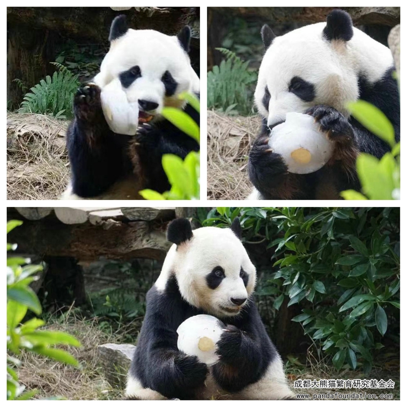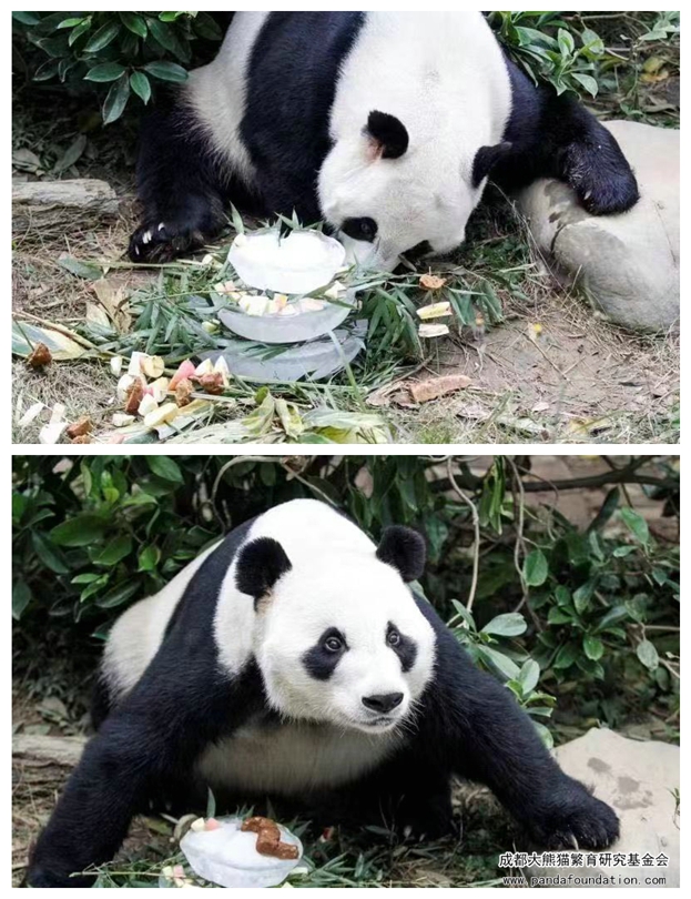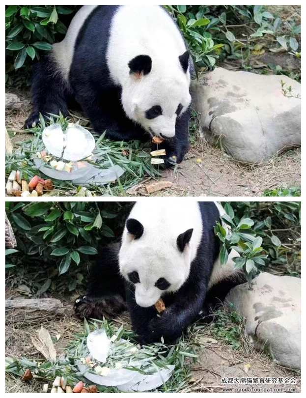 饲养员也为明浜特制了豪华冰蛋糕,还有用竹签穿上苹果、窝窝头和竹笋做成的很有成都风味的“串串”,明浜也很享受为它专门制作的美味,吃东西的萌态也让现场游客们欢呼不已。