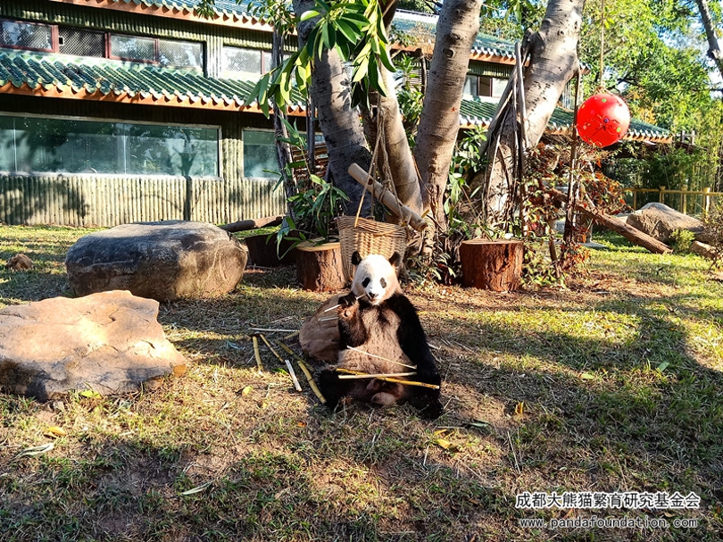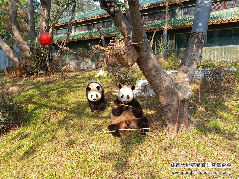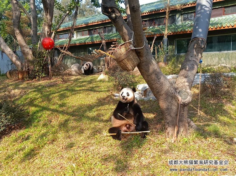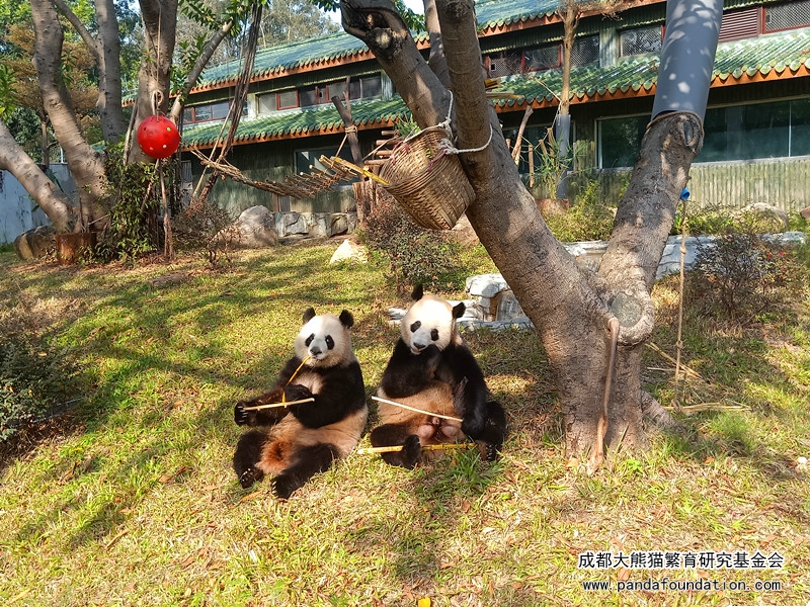 听熊猫馆的饲养员讲,目前他们每天为“星一”、“雅一”提供100kg竹叶,还有30kg左右的竹竿,另外还有苹果、窝窝头等零食加餐,营养食谱还包括玉米粉、大米粉、黄豆粉、小麦粉、燕麦片制作的窝头等。“星一”、“雅一”状态良好,体重分别为111kg和103kg。这个季节它们主要采食本地的麻竹、黄金竹,每周到货两次,贮存于竹叶储存室保鲜。看到“星一”、“雅一”在广州动物园的生活情况,各位关心它们的朋友也能放心了吧!同时,笔者也祝愿“星一”、“雅一”在广州的生活能够一直那么惬意舒适!健康成长!