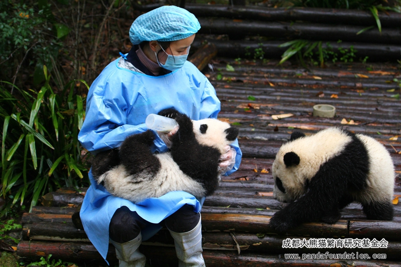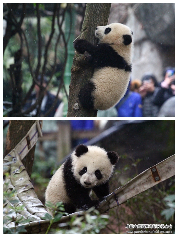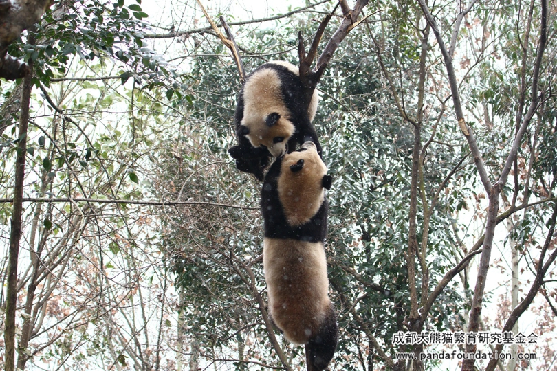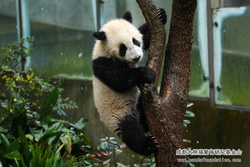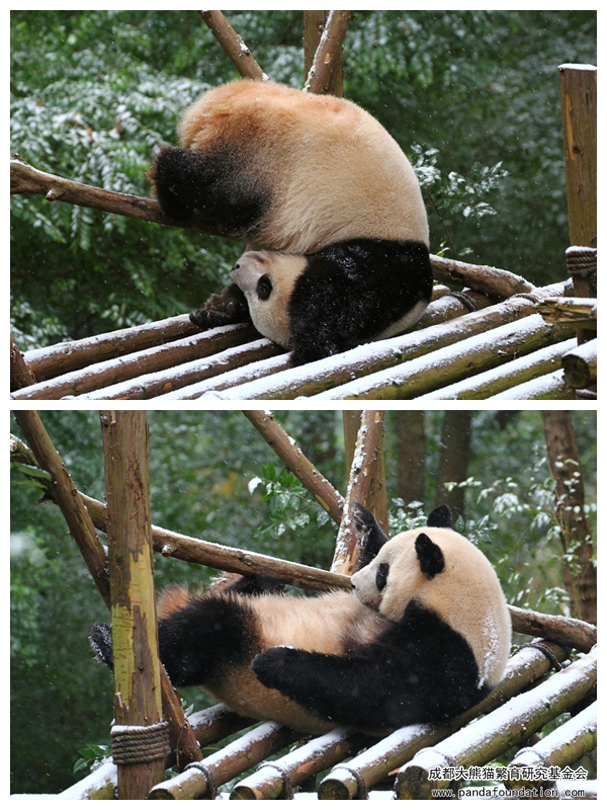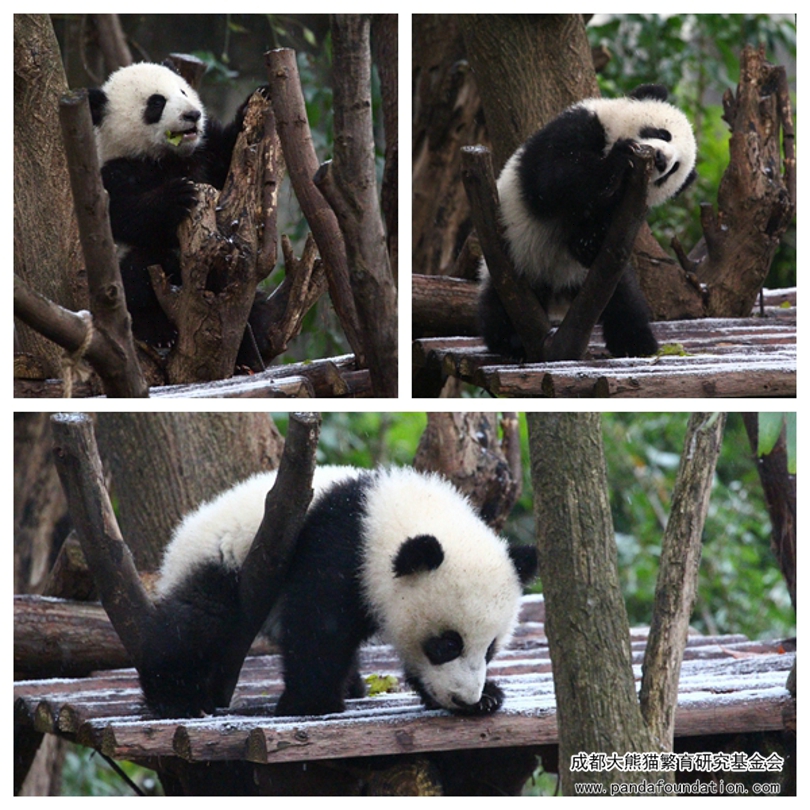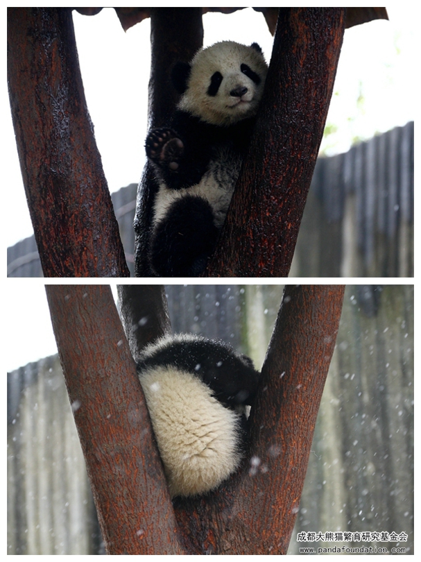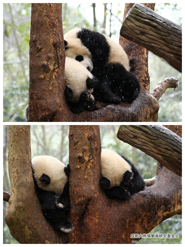 旁边的活动场里,奶妈冒着风雪给小团子们喂了瓶瓶奶,活泼的“川仔”兴奋不已,到处爬树,其他两只小团子分别在树杈和栖架上美美的睡觉。