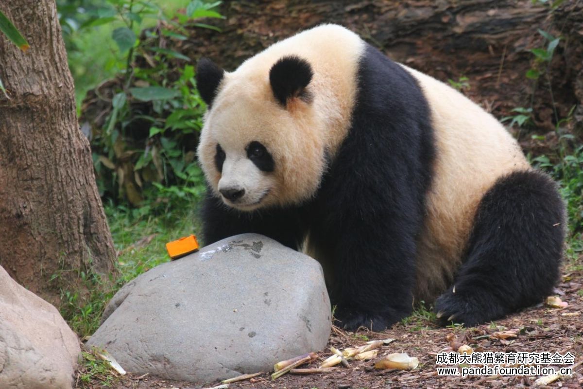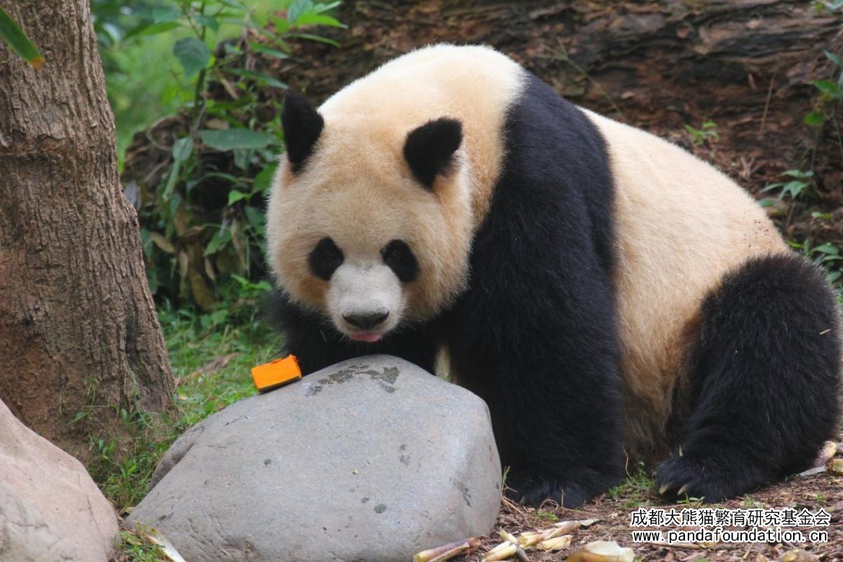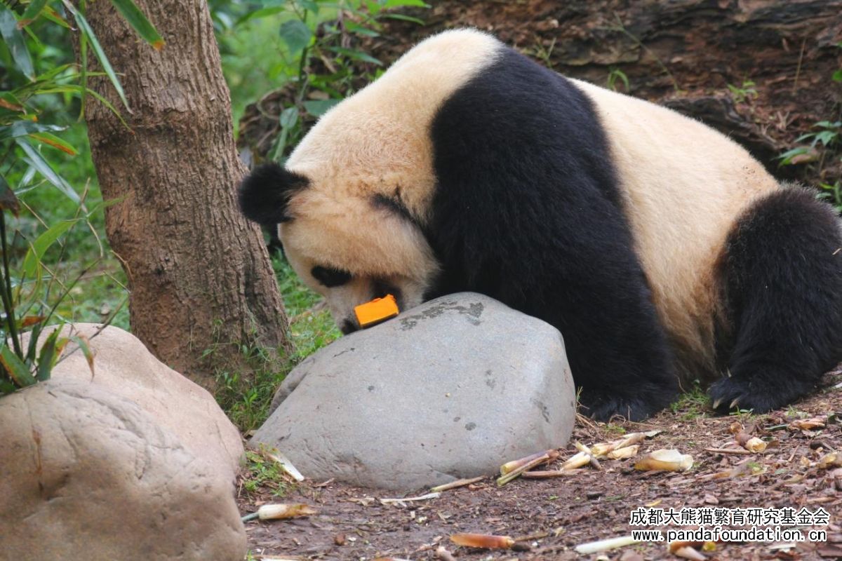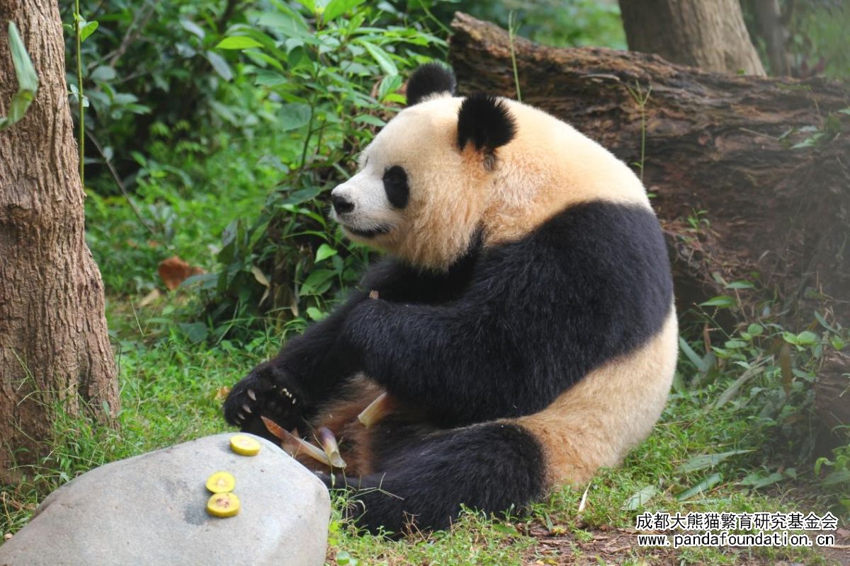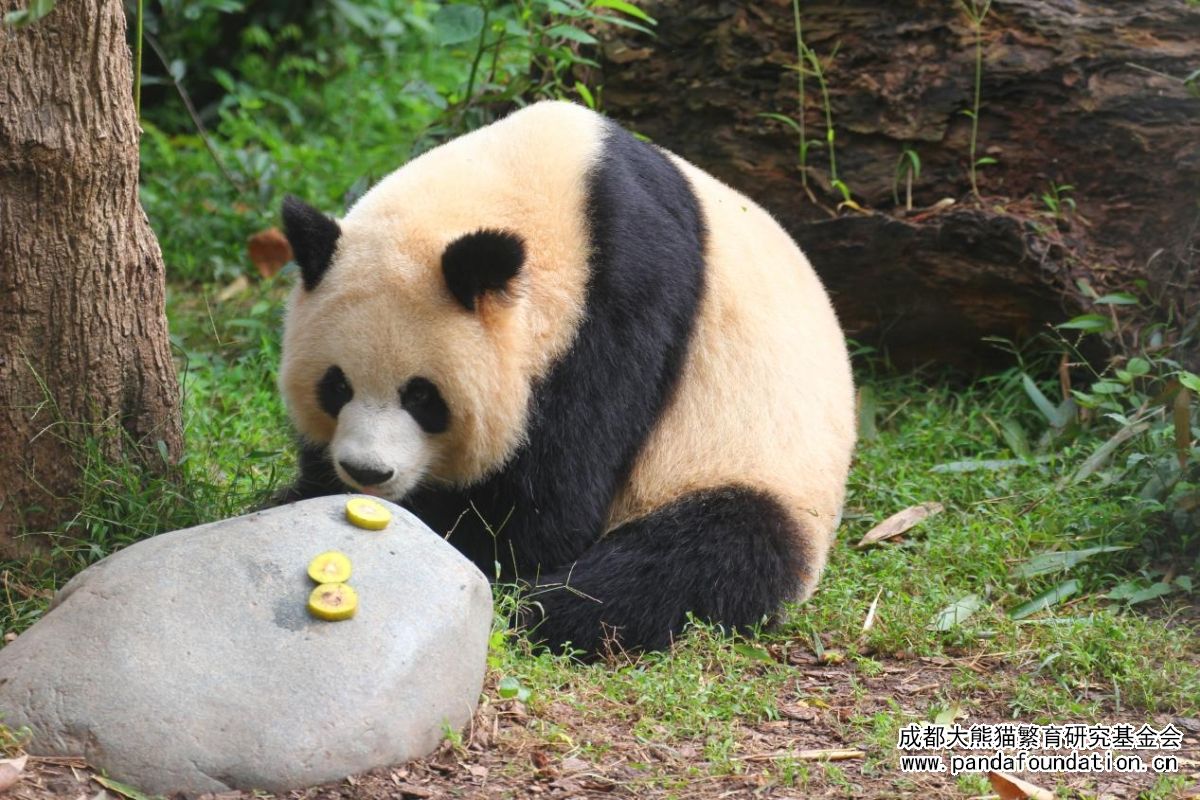 如果说脆嫩的竹笋是大熊猫园润的正餐,那么小石块上饲养员为它精心准备的果蔬便是园润专属茶歇里一道精致的点心。