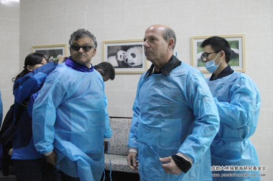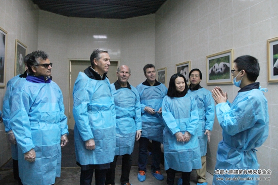 捐赠仪式结束后,霍华德•舒尔茨先生一行在我会工作人员的陪同下参观了我会设立于熊猫基地月亮产房旁的“大熊猫见习保育工作站”,并体验了大熊猫饲养员的工作。几位嘉宾亲自上阵,对大熊猫兽舍进行打扫,清扫了大熊猫粪便以及大熊猫吃剩下的竹竿、竹叶,之后还在我会工作人员的指导下体验喂养大熊猫。