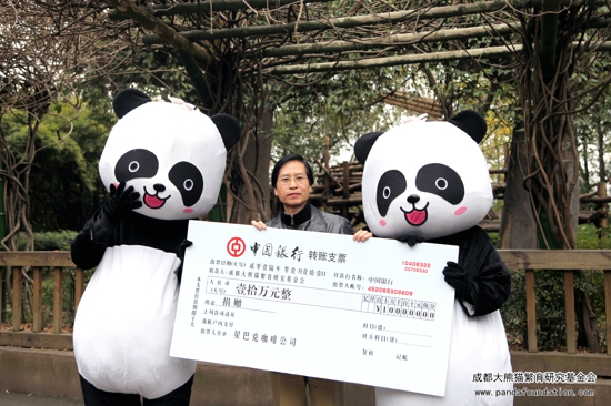 2016年1月11日下午2点,星巴克咖啡有限公司向成都大熊猫繁育研究基金会捐赠的仪式在成都大熊猫基地太阳产房前举行。星巴克咖啡有限公司董事长兼首席执行官霍华德•舒尔茨先生、星巴克中国与亚太区总裁约翰•连卡佛先生,星巴克中国总裁王静瑛女士,星巴克执行副总裁维微克•沃玛先生,星巴克中国与亚太区副总裁吉姆•欧森先生,星巴克中国副总裁崔复秋先生,以及成都大熊猫繁育研究基金会代表刘建雄、卿娟等共同出席了此次捐赠仪式。