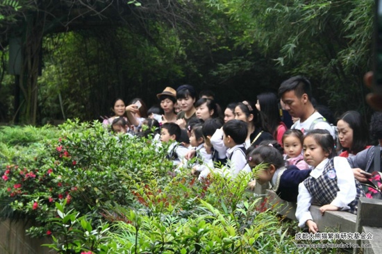 幼儿园的小朋友们和父母一起,在我会科普教员的带领下参观园区。小朋友们徜徉在熊猫的国度里,看到了幼年、成年等不同年龄阶段的大熊猫。