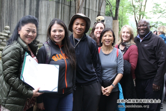 老师们手里展示着成都大熊猫繁育研究基金会的捐款证书