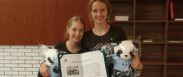来自瑞士小姐妹丽雅和艾希,不远万里来到中国四川成都大熊猫繁育研究基地,选择了2014年8月出生的大熊猫“七喜”作为终身认养对象。